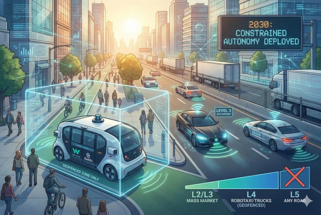 To set realistic expectations, it’s important to be clear about what won’t happen by 2030:- No widespread Level 5 autonomy (drive anywhere, anytime, in all conditions).